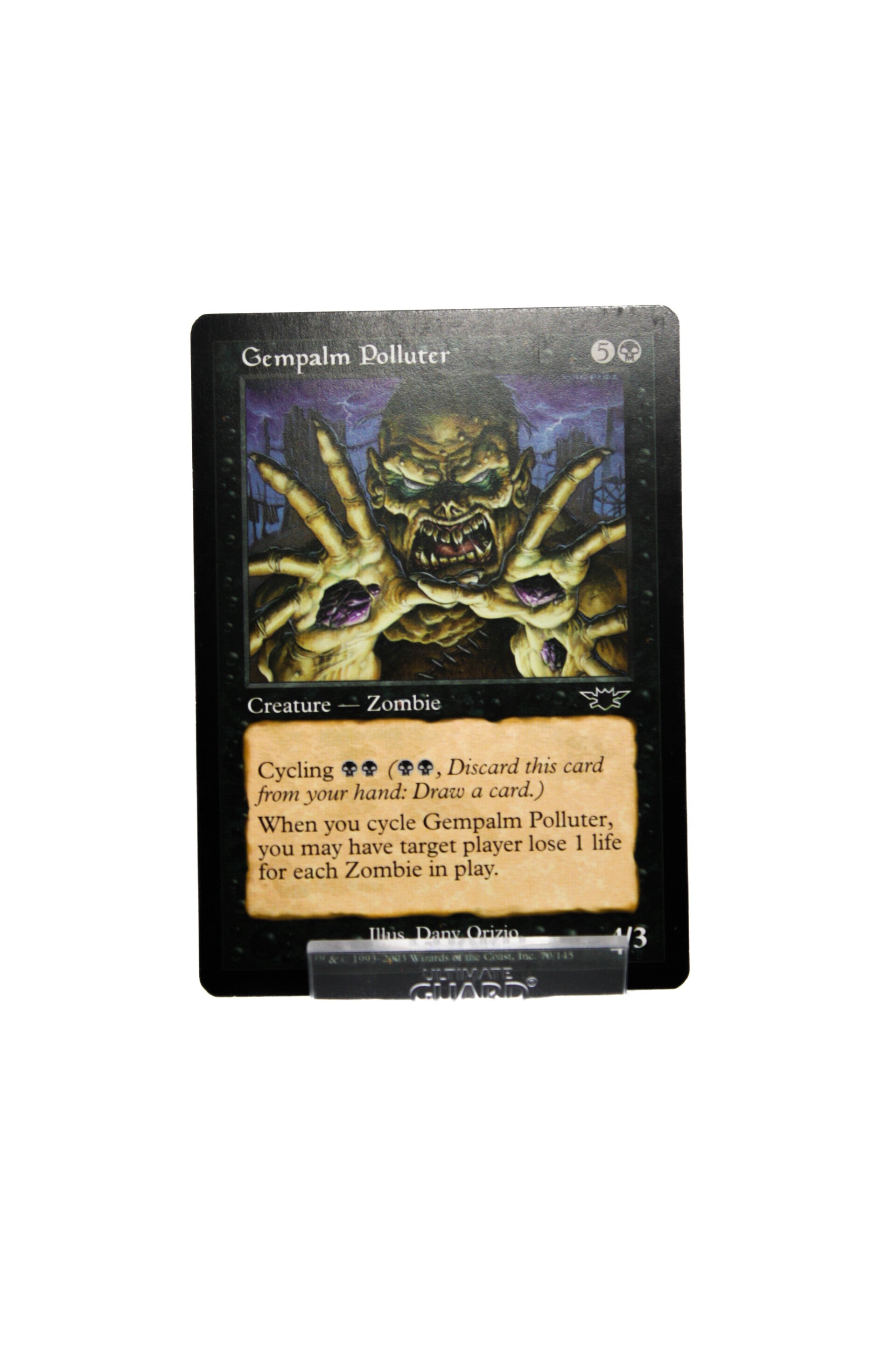 When you cycle Gempalm Polluter, you may have target player lose life equal to the number of Zombies on the battlefield."